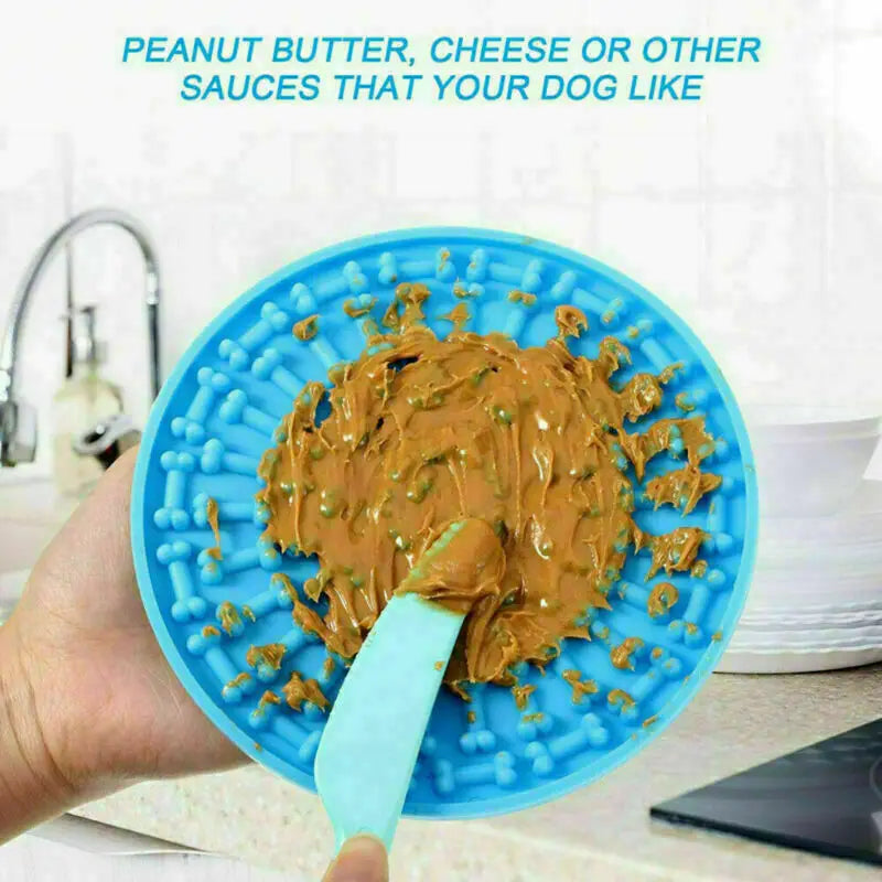 Spread soft food such as peanut butter, yogurt, bananas, or wet pet food across the mat. The raised silicone pattern helps hold the food in place, encouraging slower eating and keeping pets distracted during grooming or bath time.